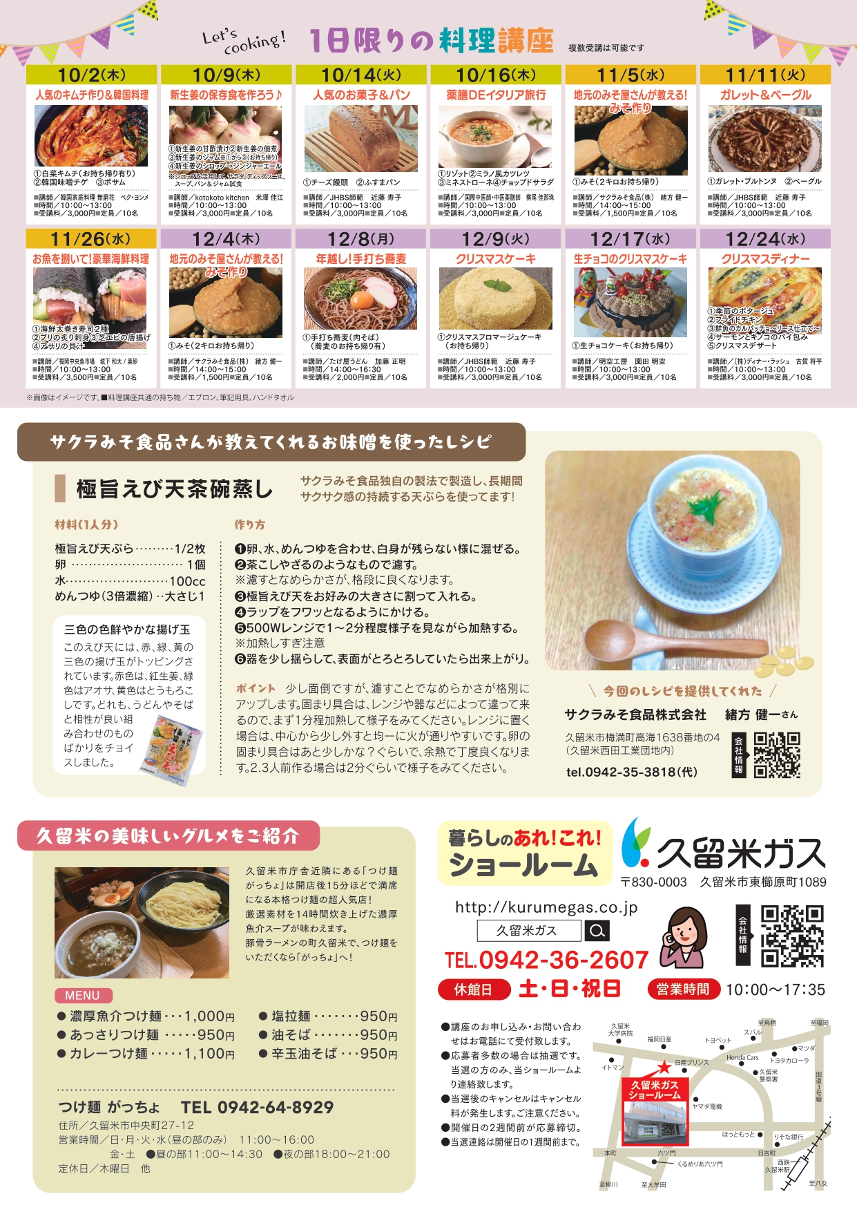 久留米ガスのショールームで開催される料理教室の詳細は、定期的に発行しているフリーペーパー「ほとめーる」の裏面にご案内させて頂いております。