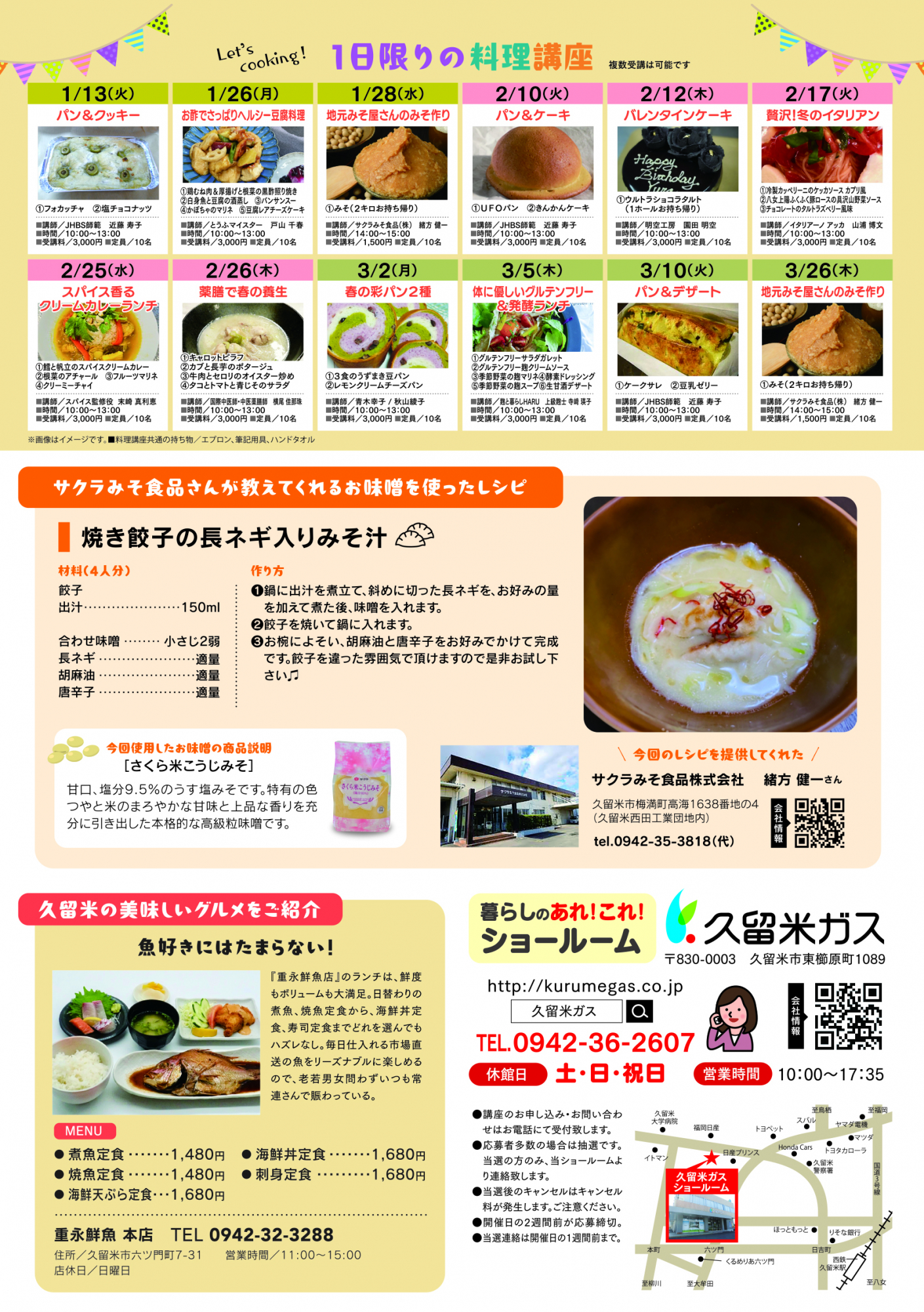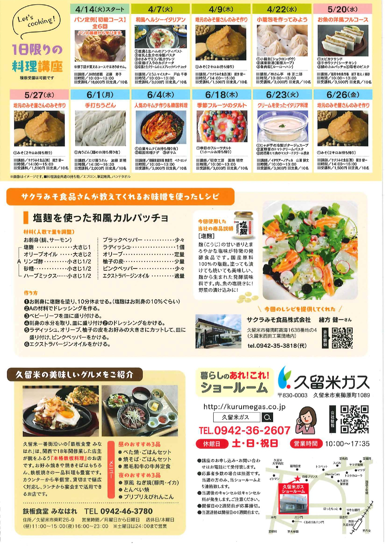 久留米ガスのショールームで開催される料理教室の詳細は、定期的に発行しているフリーペーパー「ほとめーる」の裏面にご案内させて頂いております。